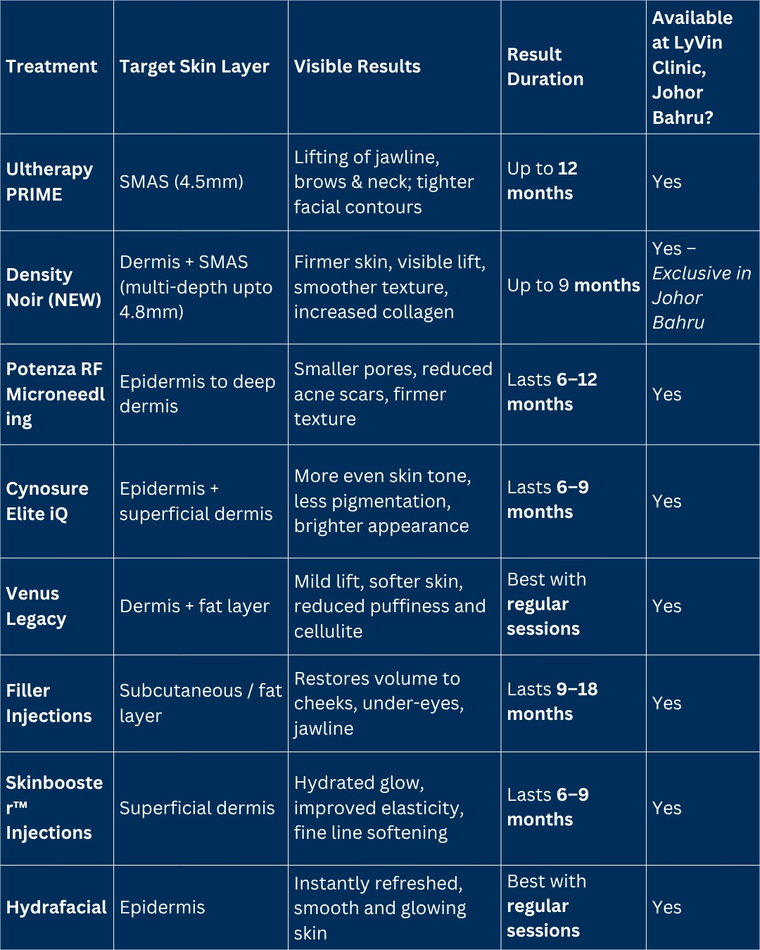 | Treatments: Ultherapy Prime (From Epidermis to SMAS Layer), Emface, Density Noir |